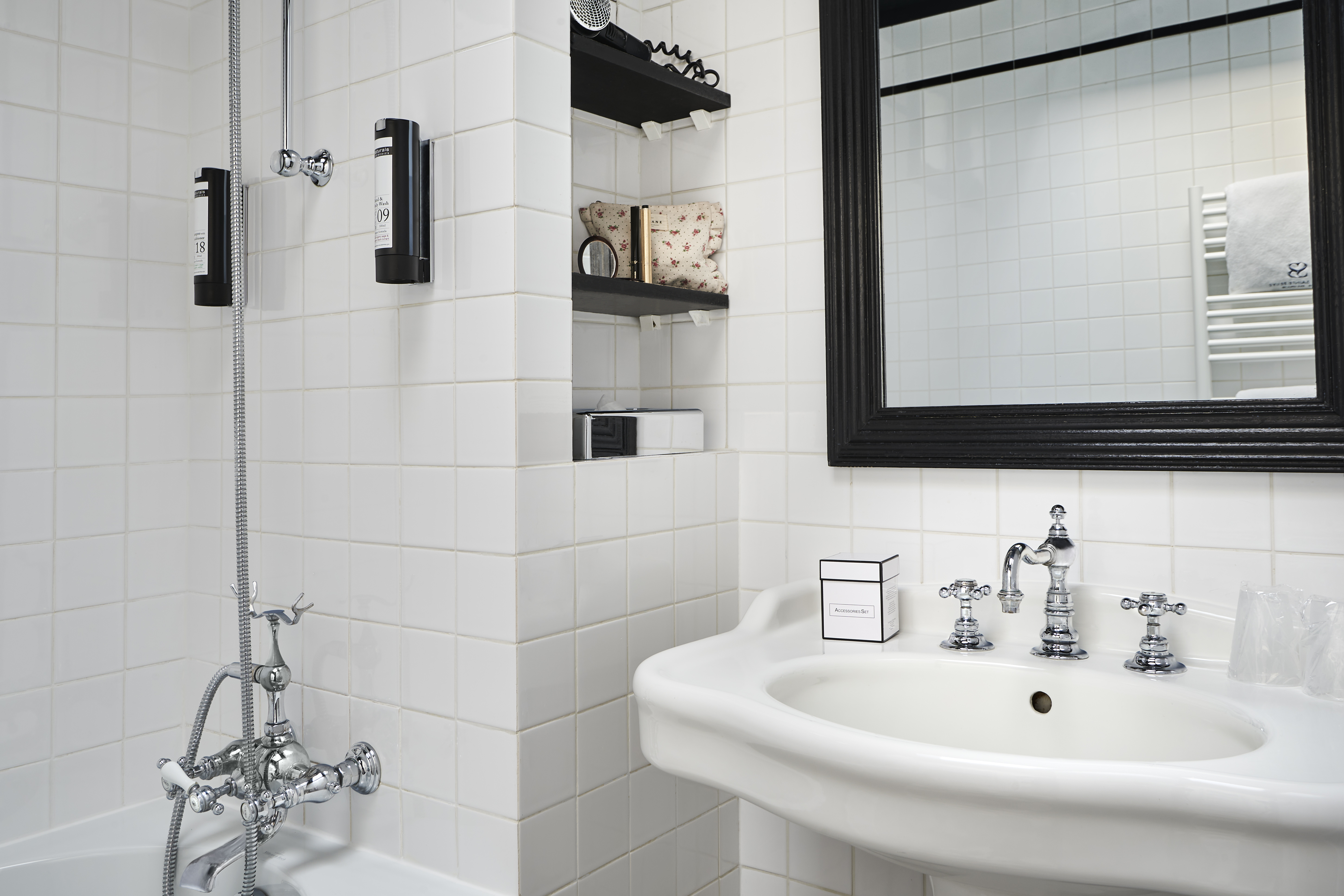 Pristine Bathrooms: Elegant fixtures and high-end toiletries that complement the luxury of a left bank hotel in Paris.
